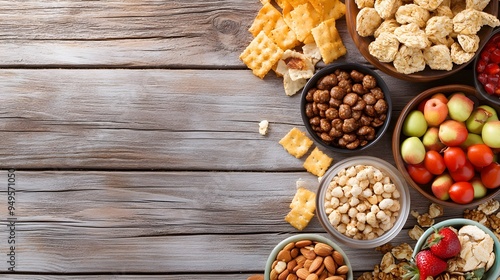 A variety of healthy high-calorie snacks on a wooden table, with copy space on the side