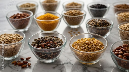A variety of seeds and grains displayed in glass bowls on a marble surface.