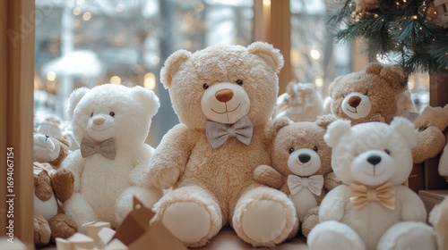 A variety of teddy bears in different sizes and colors sit on shelves and greet visitors in a cozy, illuminated toy store