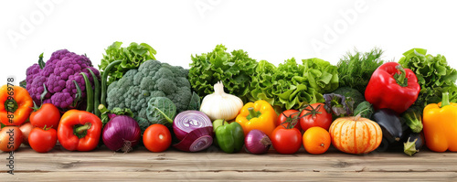 A variety of vegetables and fruits are displayed on a wooden table. The colors and textures of the produce create a vibrant and healthy atmosphere