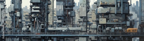 A vast cityscape of towering buildings and bridges, with a river running through the middle. The buildings are made of metal and glass, and the city is covered in a layer of smog.