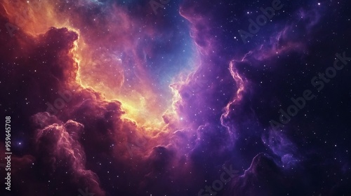 A vast, colorful nebula with wispy clouds of gas and dust illuminated by stars.
