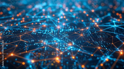 A vast digital landscape composed of interconnected blue plexus lines and glowing node