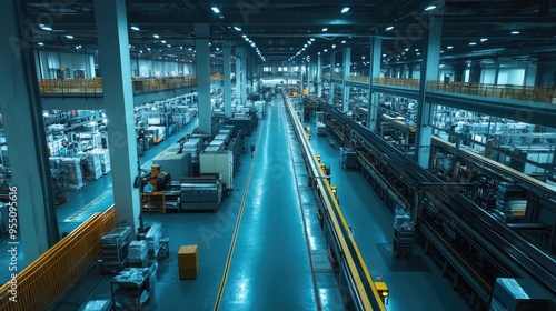 A vast, empty Chinese factory floor, with machinery and conveyor belts but no workers.
