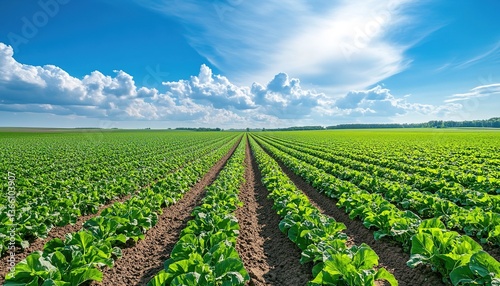 A vast farmland with neatly arranged green vegetables, fields stretching to the horizon, blue sky with white clouds in the background, sunlight casting over the fields