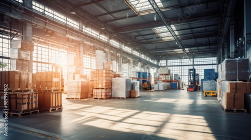 A vast industrial warehouse filled with large containers and boxes, bathed in natural light from the large windows, hinting at busy logistics operations.