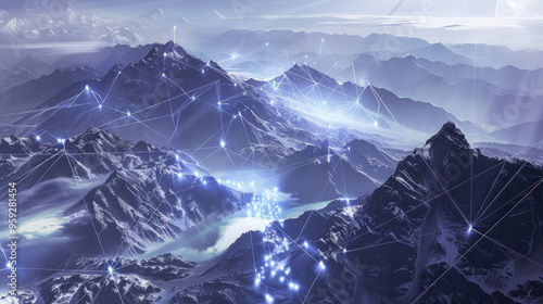 A vast mountainous landscape covered in snow, overlaid with glowing blue digital network lines connecting various points.