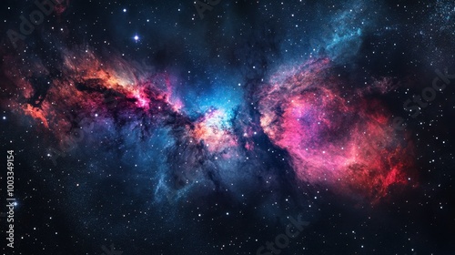 A vast nebula in deep space, with swirling pink, blue, and purple gases illuminated by bright stars.