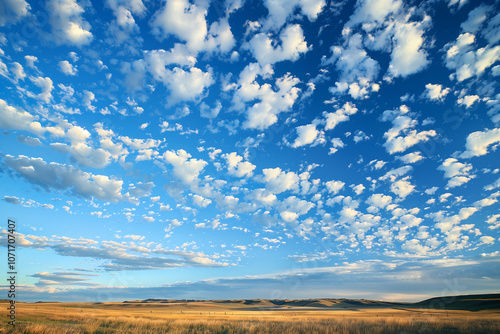 A vast sky filled with towering, cotton-like clouds in brilliant white, illuminated by the golden rays of a setting sun, casting long shadows across the landscape.