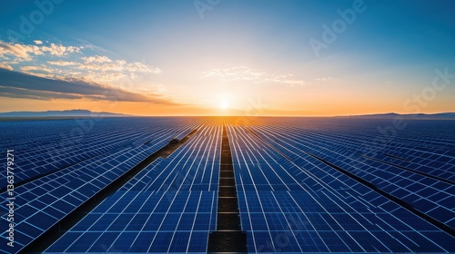 A vast solar farm with endless rows of solar panels harnessing sunlight and producing sustainable energy.