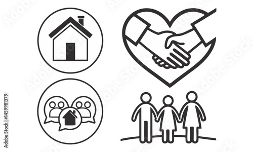A vector illustration set features family icons, including a house symbol representing home and people, ideal for business or web design concepts