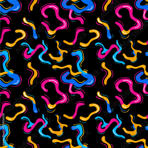 A vector vibrant abstract pattern featuring colorful, wavy shapes in pink, blue, yellow, and orange on a black background. The design is playful and dynamic, suitable for textiles or wallpapers.