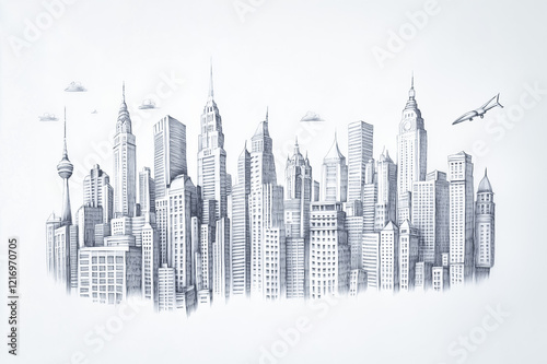 A vertical depiction of a detailed cityscape drawn in a minimalistic pencil sketch style, highlighting elegant simplicity.