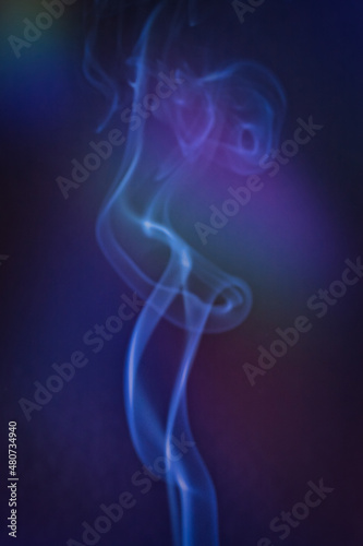 A vertical shot of smoke in colorfull backlight with a blue note