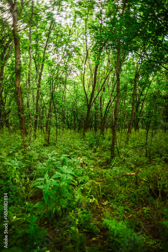 A vertical view of an enchanting forest floor covered in dense green plants and low-lying foliage, with tall, thin trees forming a natural canopy overhead in the soft light of a summer day.