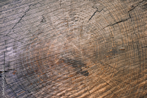 A very old olive tree stump. Age ranges of the tree can be seen on the ground. old wood texture