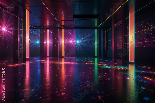 A vibrant 1980s disco dance floor illuminated by colorful neon lights.