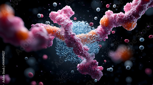 A vibrant 3D rendering of a complex biological structure possibly a protein or cellular component. Suggests scientific research or medical application.
