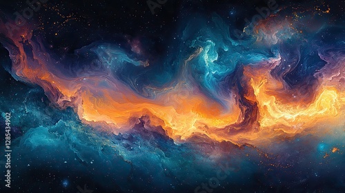 A vibrant abstract artwork features swirling colors and textures, radiating light and energy The piece evokes a sense of cosmic wonder and depth with rich hues of blue, orange, and purple