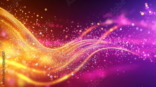 A vibrant abstract background featuring flowing waves of multicolored light and shimmering particles in hues of purple, orange, and gold.