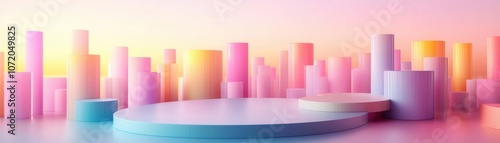 A vibrant, abstract cityscape with colorful cylindrical forms against a gradient background, creating a modern, surreal atmosphere.