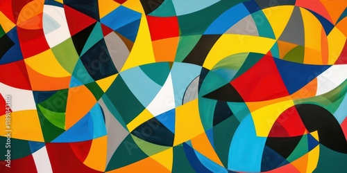 A vibrant abstract composition featuring dynamic shapes and bold colors, evoking energy and movement.