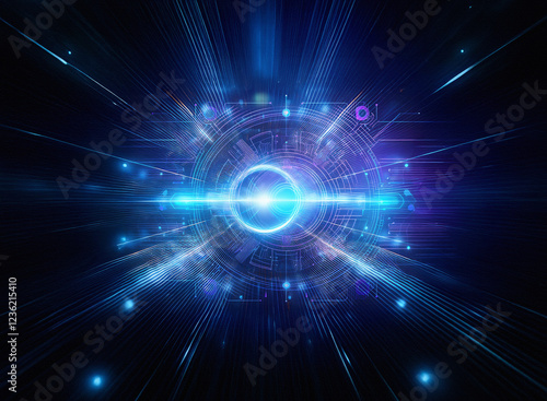 A vibrant, abstract depiction of a futuristic, technological core emitting radiant blue energy beams. The design suggests speed, innovation, and power.