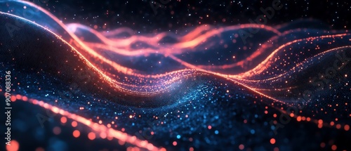 A vibrant, abstract depiction of flowing waves with shimmering particles, showcasing a blend of blue and red hues, evoking a sense of depth and energy
