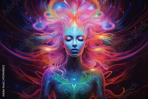 A vibrant abstract design features swirling neon colors around an ethereal figure, radiating cosmic energy and embodying otherworldly strength and unity.