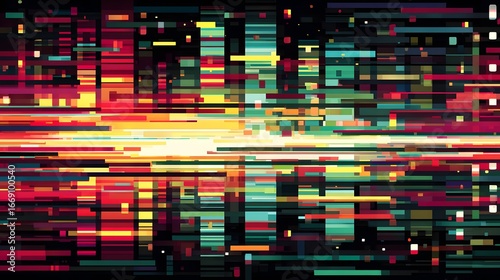 A vibrant abstract design featuring a multitude of overlapping horizontal lines and blocks in a spectrum of colors, creating a dynamic and energetic visual composition.