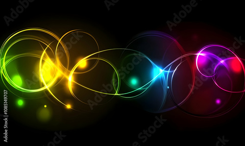 A vibrant abstract design featuring colorful swirls and light effects on a dark background.