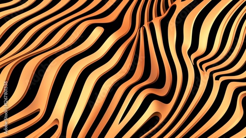 A vibrant abstract design featuring dynamic black and orange wave patterns.