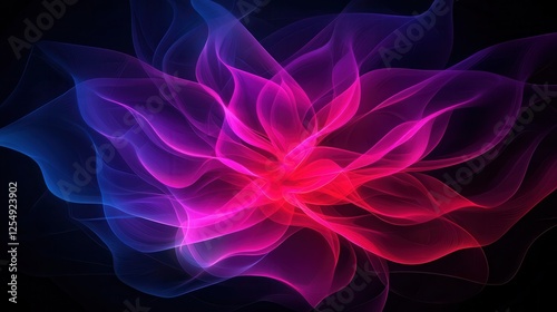 A vibrant, abstract design featuring flowing shapes in shades of blue and pink, resembling a blossoming flower against a dark background.