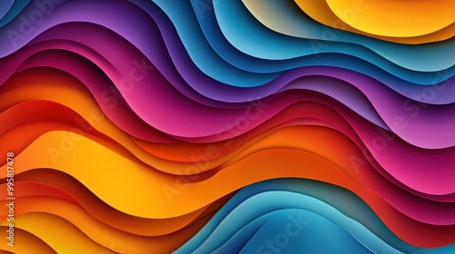 A vibrant abstract design featuring flowing waves of purple, orange, yellow, and blue, creating a dynamic and energetic feel.