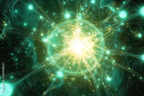 A vibrant, abstract digital artwork depicts a luminous, central sphere radiating energy outwards, surrounded by swirling teal nebulae and glowing particles.