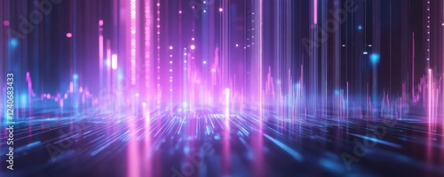 A vibrant, abstract display of colorful light beams in shades of pink and blue, creating a dynamic, futuristic atmosphere.
