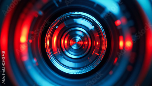 A vibrant, abstract front view close-up of a camera lens, a dynamic interplay of colors and reflections. Concept of high technology, television or film production, video shooting, movie industry