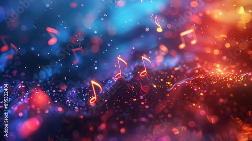 A vibrant abstract image featuring a dynamic flow of colors and 3D shapes, interspersed with various music symbols creating a visually engaging fusion.