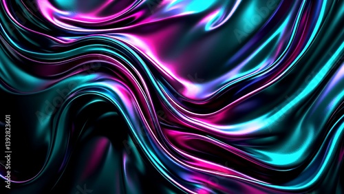 A vibrant, abstract image featuring flowing, iridescent waves of fabric in shades of purple, blue, and black, creating a dynamic and visually striking effect.