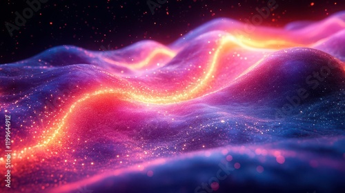 A vibrant, abstract landscape of colorful waves, illuminated by glowing light trails and sprinkled with shimmering stars against a dark background.