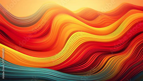A vibrant abstract landscape with flowing waves of red, orange, and yellow, evoking warmth and energy in a dynamic composition.
