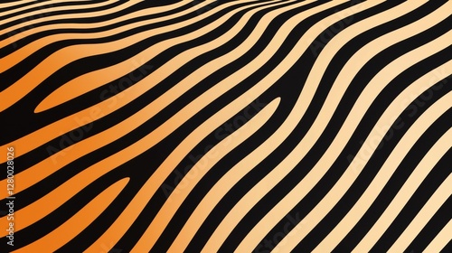A vibrant abstract pattern of wavy stripes in orange and beige against a black background, creating a dynamic visual effect.