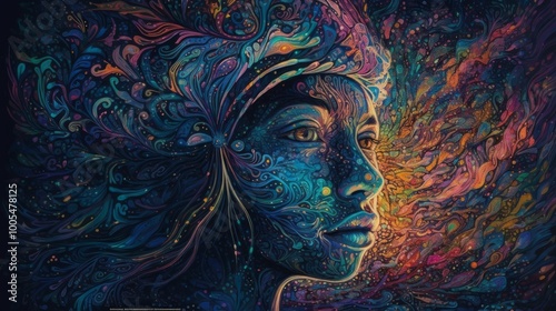 A vibrant, abstract portrait blending human features with cosmic elements.