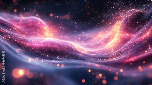 A vibrant abstract representation of cosmic waves with glowing particles and colors.