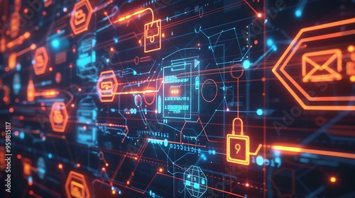 A vibrant, abstract representation of cyber-security, with glowing icons and futuristic digital elements against a dark, tech-focused background,