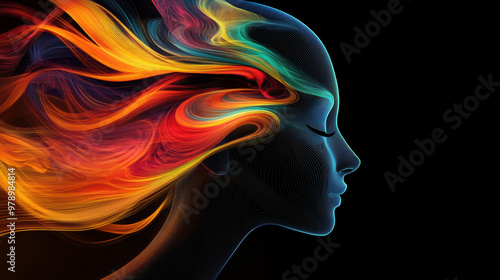 A vibrant abstract representation of womans profile, featuring flowing hair in vivid colors like orange, red, and green, set against dark background. image evokes sense of creativity and energy