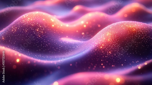 A vibrant, abstract surface with flowing waves, illuminated by sparkling particles in shades of purple, pink, and blue.