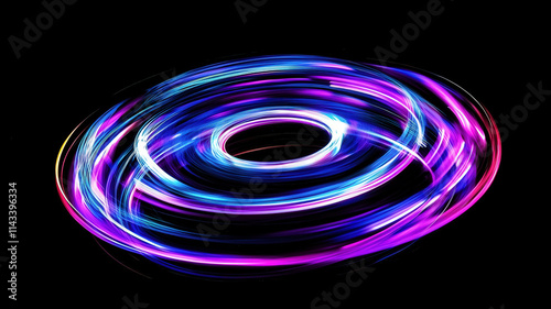 A vibrant abstract swirl of neon blue and purple light trails, creating a dynamic and futuristic effect, perfect for conveying energy, movement, and modern design aesthetics.