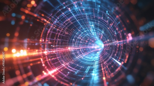 A vibrant abstract tunnel of colorful light beams radiating in a digital space, representing energy and movement.