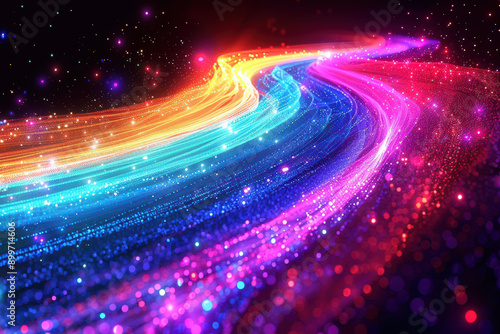 A vibrant, abstract wave of light and color with a spectrum of rainbow hues, creating a dynamic and energetic visual effect in a cosmic digital design.